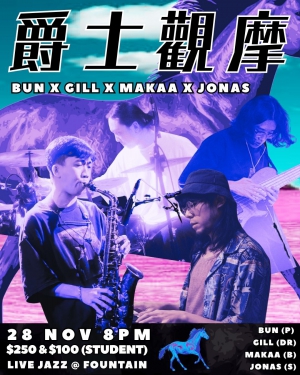 今次喺Fountain嘅演出,Bun將會聯同本地樂隊CODE嘅rhythm section一齊表演,由Makaa負責低音結他,Gill Mok負責鼓,肯定十分groovy!當晚會演奏多首fusion jazz作品,包括Robert Glasper、Kenny Garrett嘅音樂,同佢個人嘅原創作品。