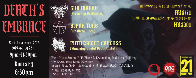 即係咁啦,地獄之門又開啦!The Underground 今年最後一場 show「Death's Embrace」11月22號會喺觀塘浪潮音樂工作室舉行,想投身死亡金屬嘅狂熱?今次就係你畀自己俾魔鬼搵嘅機會!雖然音樂勁邪惡,但場內一定好熱情,新舊樂迷一齊撞入結他牆包圍嘅地窖,等你開心爆晒!