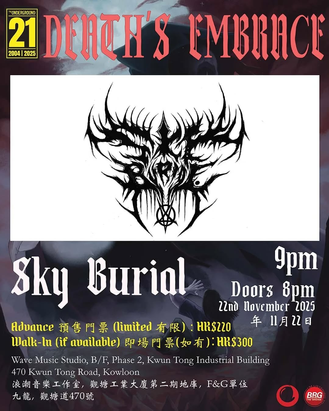率先登場嘅係Sky Burial,係2017年出道嘅Slam Deathcore樂隊。佢哋上年喺Death Metal Dungeon畀我哋reviewer都話:「靈魂都畀佢哋嘅重vocals、癲結他同暴力鼓聲攪到生生猛猛咁!」