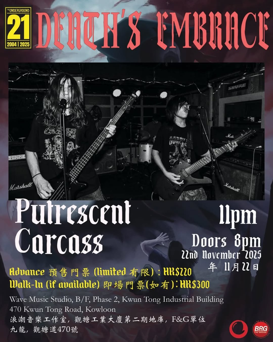 最後重頭戲新鮮登場,Putrescent Carcass三人組,已經引起圈中熱話,佢哋嘅死金現場set包括percussive growls、slam爆節奏同腐朽riff,包你即刻扯晒旗!
