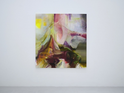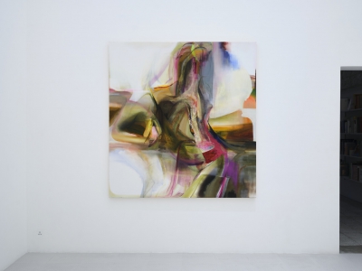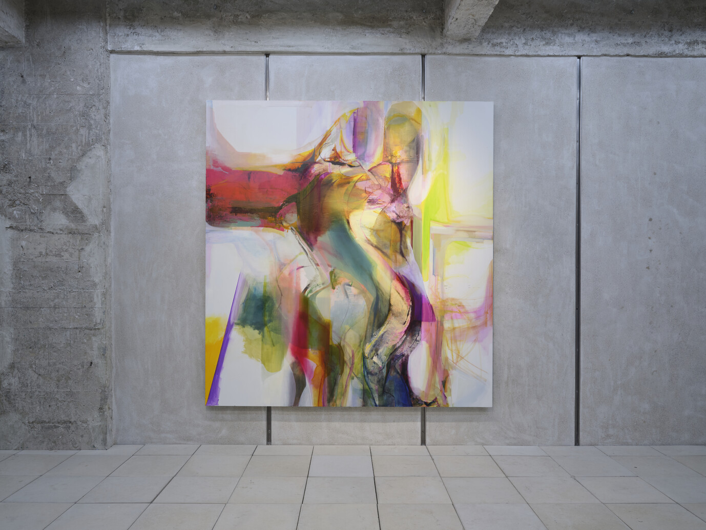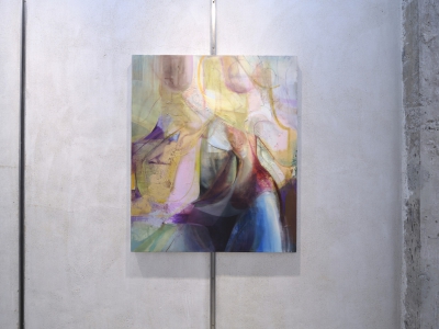 《你,姑娘》(2025)引用了布龍齊諾《維納斯和丘比特的寓言》的基本結構。卡尼將一個受天使簇擁的人物轉化爲高度抽象化的形態,隨後又通過顏料和肌理的層疊堆積將這模糊形態變得具體而沈重。清淡且不規則的光芒從多個角度漫入畫面,穿透構圖中心的形象,而這形象內外的複雜細節平衡了整體畫面,造就了一個由豐富筆觸蹤跡構成的蔚然景象。