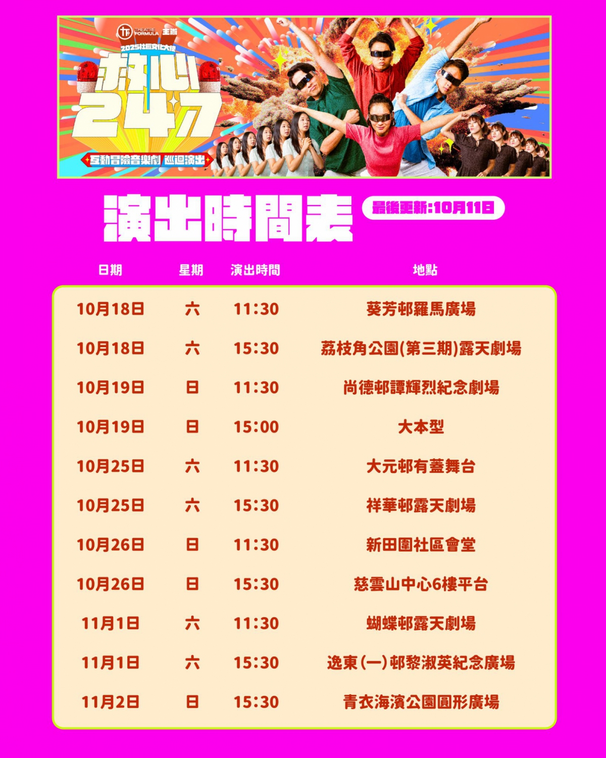劇場方程式首次走入社區,透過超級英雄主題的故事,將對心理健康的關注,在歡樂之中與大家分享。音樂劇演出將於全港十八區的公眾地方巡迴上演,配合創作、速寫、形體等工作坊,讓觀眾能全天候24/7心靈 carefree,人生輕鬆啲!