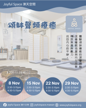 由專業導師帶領,體驗頌缽療癒的深層放鬆、改善睡眠品質與內在平衡、釋放焦慮與壓力、找回內心的平靜。