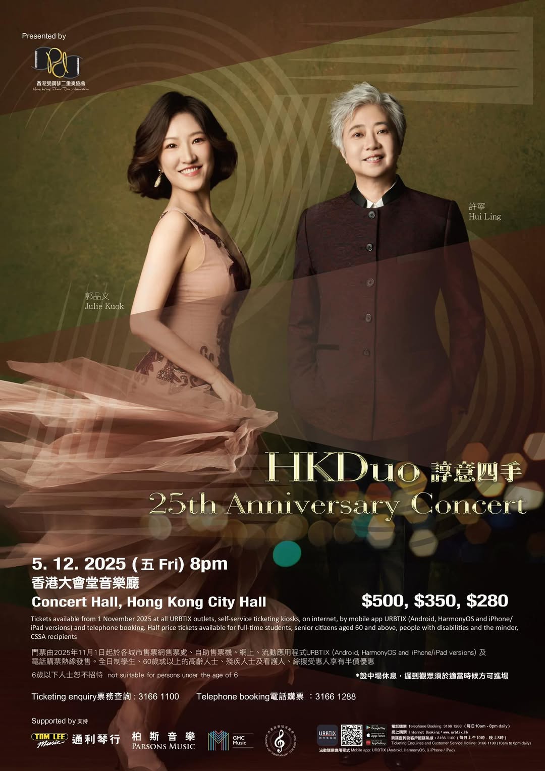 為本次音樂會,我們不僅準備了全新曲目,更榮幸呈現由Julie為盛會特別創作的四手聯彈作品《末日舞后》。樂曲靈感取自香港經典電影《破地獄》主題曲,將於音樂會中進行世界首演,誠為一大亮點。