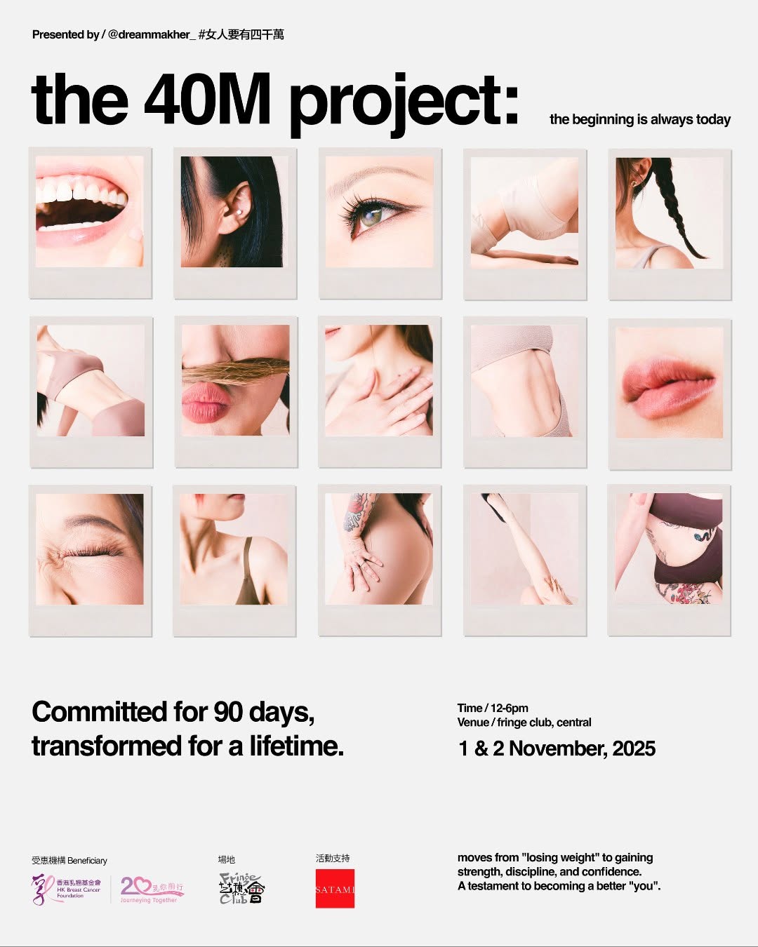 想知 90 日能帶來幾大轉變?#女人要有四千萬 呈獻 : The 40M project 2.0 攝影展等你見證!40 + 女性故事,從健康管理到個人成長,藏住自律煉就的自信與力量。除此之外,還有4個分享環節。由於場館位置有限,敬請與@shinning_shinnie 預約。會場特別設置限量紀念環保袋,同時擺放籌款箱,所有收益將全數撥捐香港乳癌基金。
