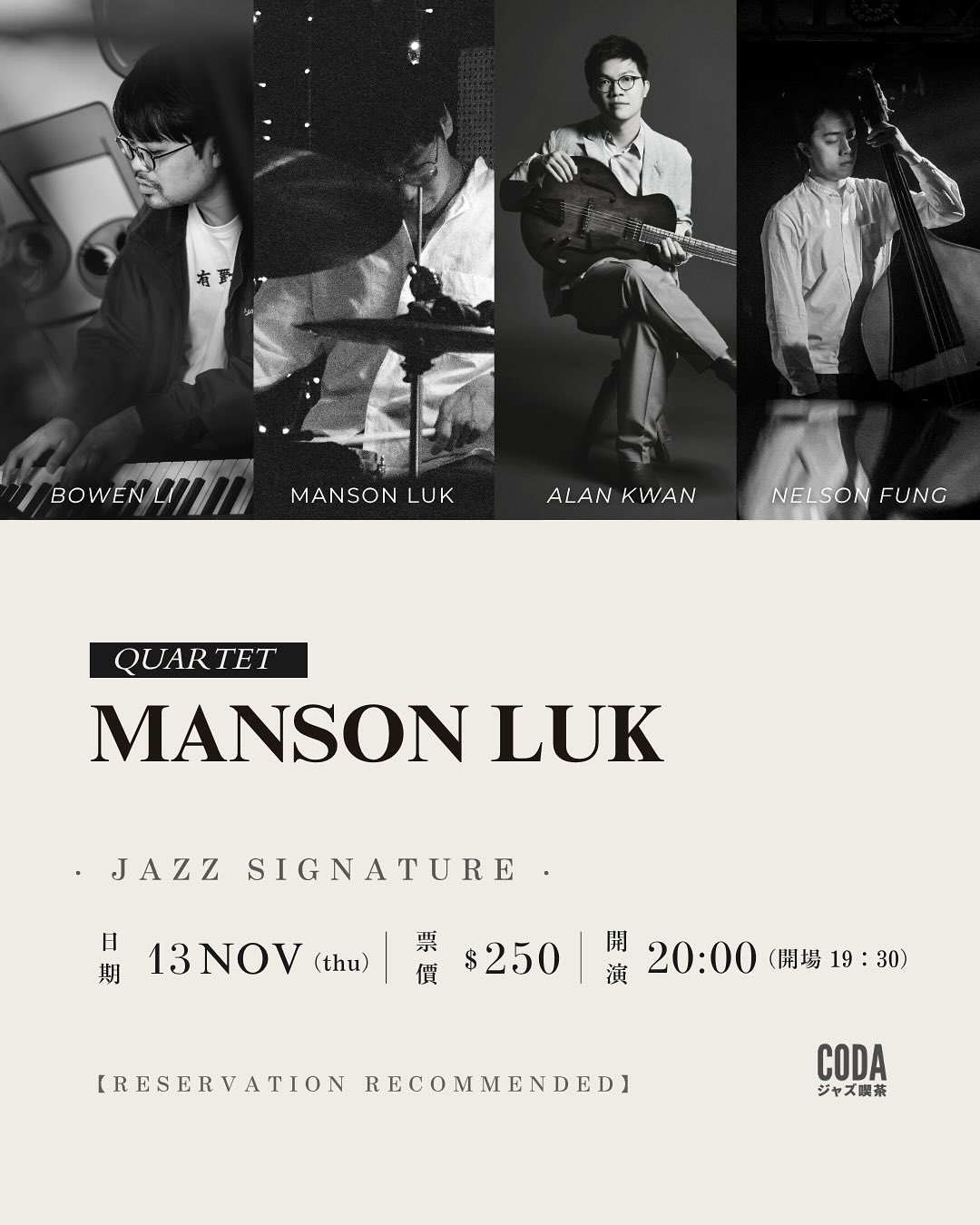 此次回歸香港舞台,Manson 將於 CODA Jazz Kissa 集結結他手Alan Kwan、鋼琴手Bowen Li與低音提琴手Nelson Fung組成四重奏。音樂會將築起澳洲與香港爵士的橋樑,曲目涵蓋已故傳奇Judy Bailey的經典之作,以及Alan、Bowen與Manson自己的原創作品,敬請期待!
