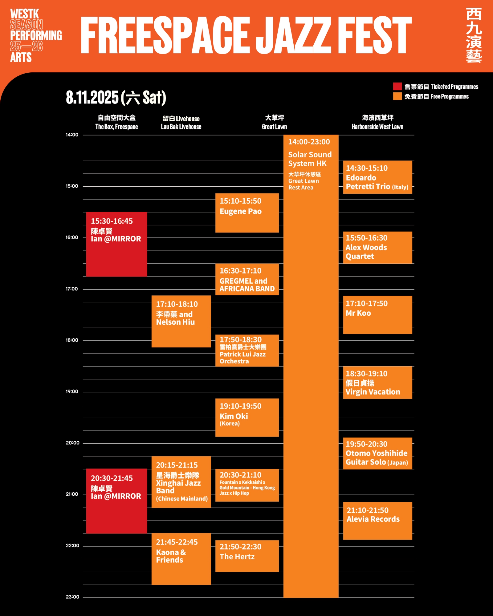 今年自由爵士音樂節的免費演出陣容包括多個本地和國際演出單位,呈獻多元風格音樂免費演出將分為三大據點,於藝術公園大草坪、海濱西草坪、留白Livehouse 為你送上精彩音樂與藝術體驗!