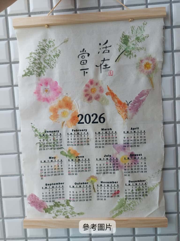 工作坊簡介: 一年又快將要結束了,新的開始總讓人感到期待。 這個工作坊裏,導師會預先替你採集好新鮮花朵及植物葉片。 然後,你將會學習把最自然美好的色彩與紋路拓印下來,製作成一幅可以懸掛起來的2026年曆紙製品。 你並且可以在年曆上,親手寫下貼心提示祝福字句。