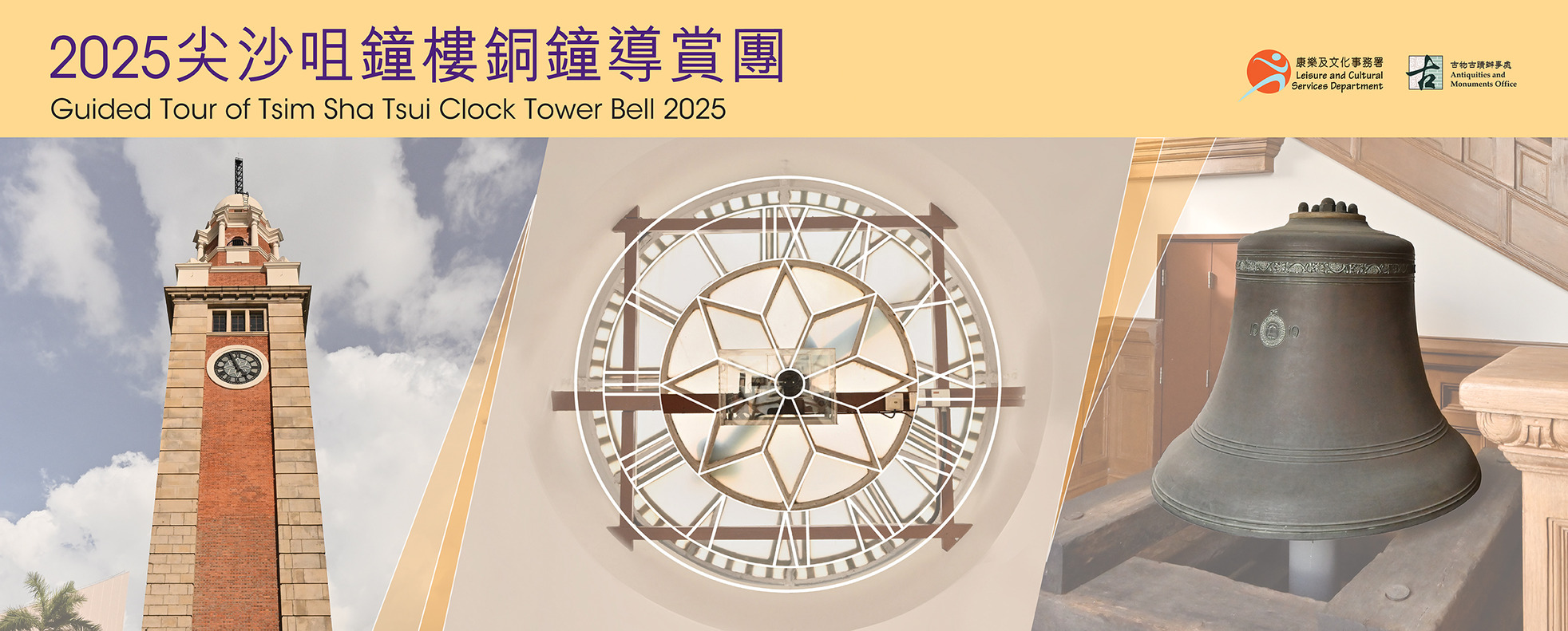 透過「尖沙咀鐘樓銅鐘導賞團」,公眾將有機會近距離參觀位於鐘樓地下的百年銅鐘,並了解這項珍貴的香港法定古蹟如何再次啟動鳴響。更多詳情:https://www.lcsd.gov.hk/tc/hkcc/TSTClockTower/opendaycumguidedtour.html對象: 6歲或以上人士名額: 每團50人