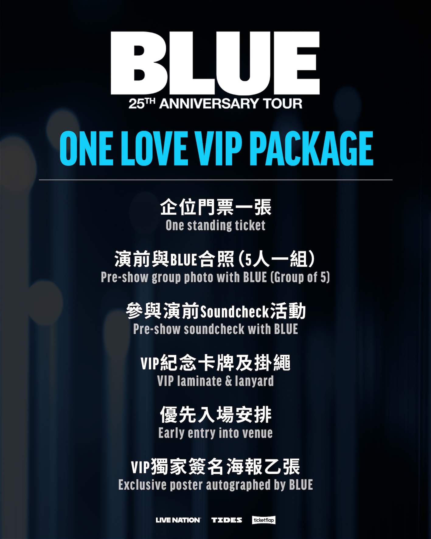 由 Antony Costa、Duncan James、Lee Ryan 與 Simon Webbe 組成的 Blue,自出道以來累積全球銷量達 1,500 萬。Blue 在英國本土榮獲 3 張冠軍專輯與 10 首打入前十名的單曲,更曾榮獲 Brit Awards 與 MTV Asia Awards,並與 Elton John、Stevie Wonder 等傳奇巨星合作。樂隊於 2000 年在倫敦成立,翌年以首支單曲 「All Rise 」一炮而紅;即使時隔二十多年,該曲依然歷久常新,別具魅力。Blue 於電視節目 The Big Breakfast首次亮相,當時仍是新人的他們以「本週家庭」身分更連續五天現身節目,並於同週六在 CD:UK 完成首個現場電視演出。當 All Rise 殺入英國單曲榜前十之際,全國歌迷熱度迅速攀升,「Blue Fever」正式爆發。