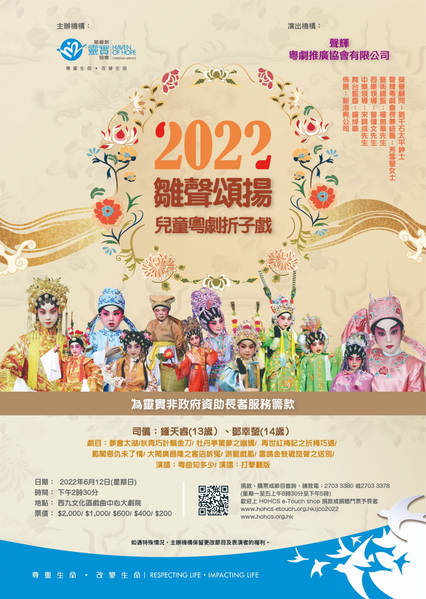 2022「雛聲頌揚:兒童粵劇折子戲」是基督教靈實協會於今年首次舉行的實體慈善籌款活動,並繼續由一班來自聲輝粵劇推廣協會的小生花旦擔綱演出。期望大家能在欣賞粵劇之餘,亦能用心感受小演員對粵劇的熱情,和對弱勢人士的關懷與愛心。是次演出為靈實非政府資助長者服務籌款,受惠服務單位包括靈實全護通(TotalCare)。