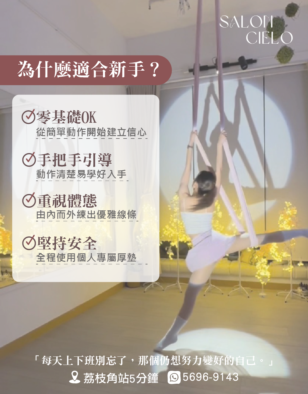 專業導師與小班教學,讓您在安全又有趣的環境中探索空中藝術,強化核心,舒緩壓力,找回自信與活力!