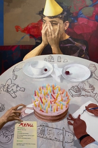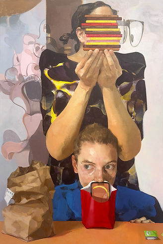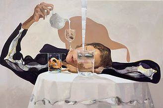 她的敘事充滿玩味:餐桌被拆解為界⾯,⻝物被轉譯為代碼與聲⾳,⼆維碼引⼊聽覺,使繪畫成為多感官的分配機制。《藝術的味道》將藝術史的符號裝飾為⼀場感官盛宴,顯露她對圖像權⼒與流通邏輯的⾃我調侃,⻯蝦成為Robert Indiana 的「LOVE」, 回折為⼀場感官盛宴,顯露她對圖像權⼒與流通邏輯的⾃我侃調為」,畢卡索的蛋糕、羅斯科的湯與蒙德⾥安的桌⼦同場共演,藝術史被轉化為視覺盛宴的隱喻。她近年在創作上的「放鬆」並⾮隨意,⽽是對秩序與混沌之間張⼒的⾃然掌控,她拒絕重複與外部驅動,維持對變化的敏感。