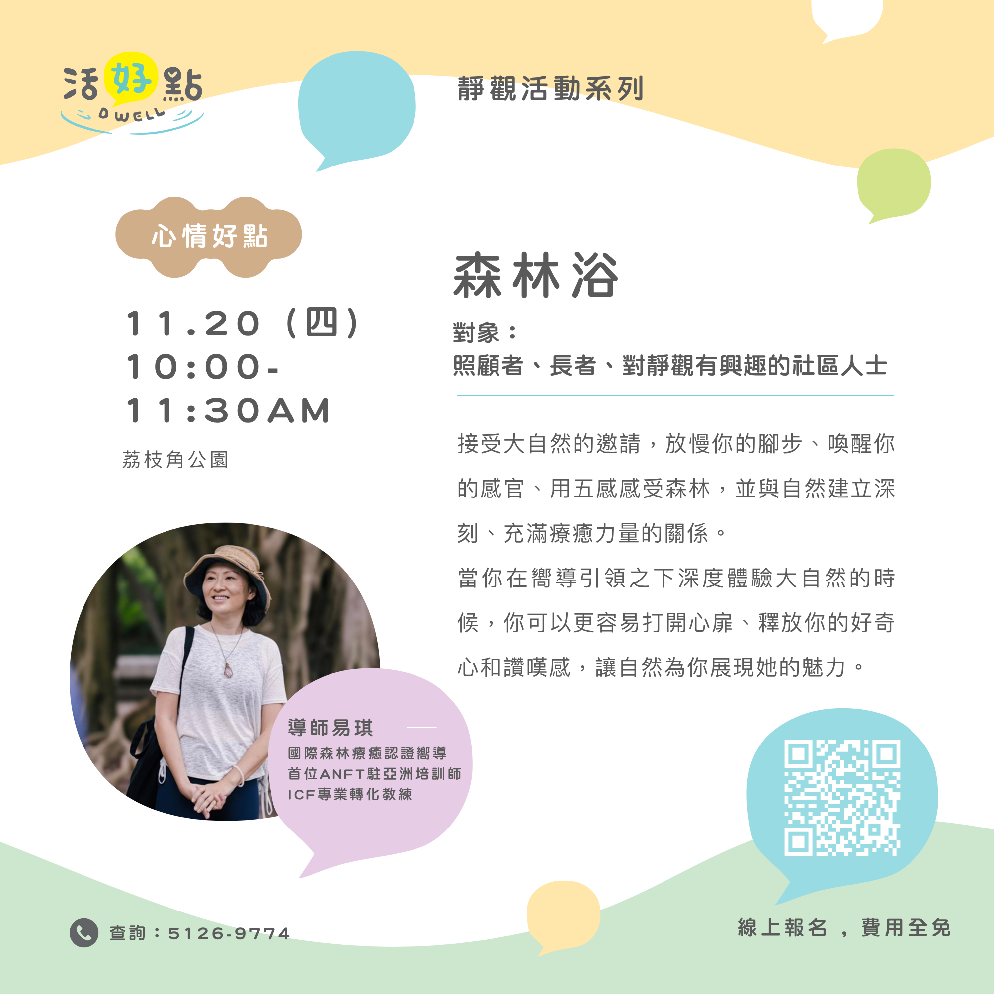 在繁囂城市中,讓我們一起打開五感,細味大自然最簡單安靜的邀請,發掘生命的療癒力。帶著柔軟的初心,踏進荔枝角公園的樹影花影之間,呼吸間築起與自然的聯繫——這刻,專注於微風、陽光和大地,心自然地慢慢鬆下來。導師 Amanda 會引領大家走入森林浴體驗,以覺察和傾聽去滋養內心寧靜。