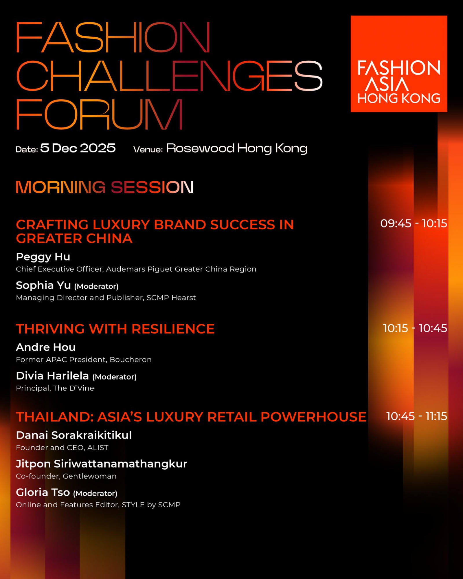 「時尚未來論壇」將於 2025 年 12 月 5 日假香港瑰麗酒店麗府宴會廳舉行,深入探討塑造時尚未來的核心力量。論壇雲集全球行業翹楚與尊貴嘉賓,包括頂尖時裝零售領袖、創意設計菁英及具影響力的業界先驅,分享專業洞見並激發變革性想法,吸引本地及國際觀眾共探新興趨勢,創新策略與增長機遇。論壇焦點主題包括: