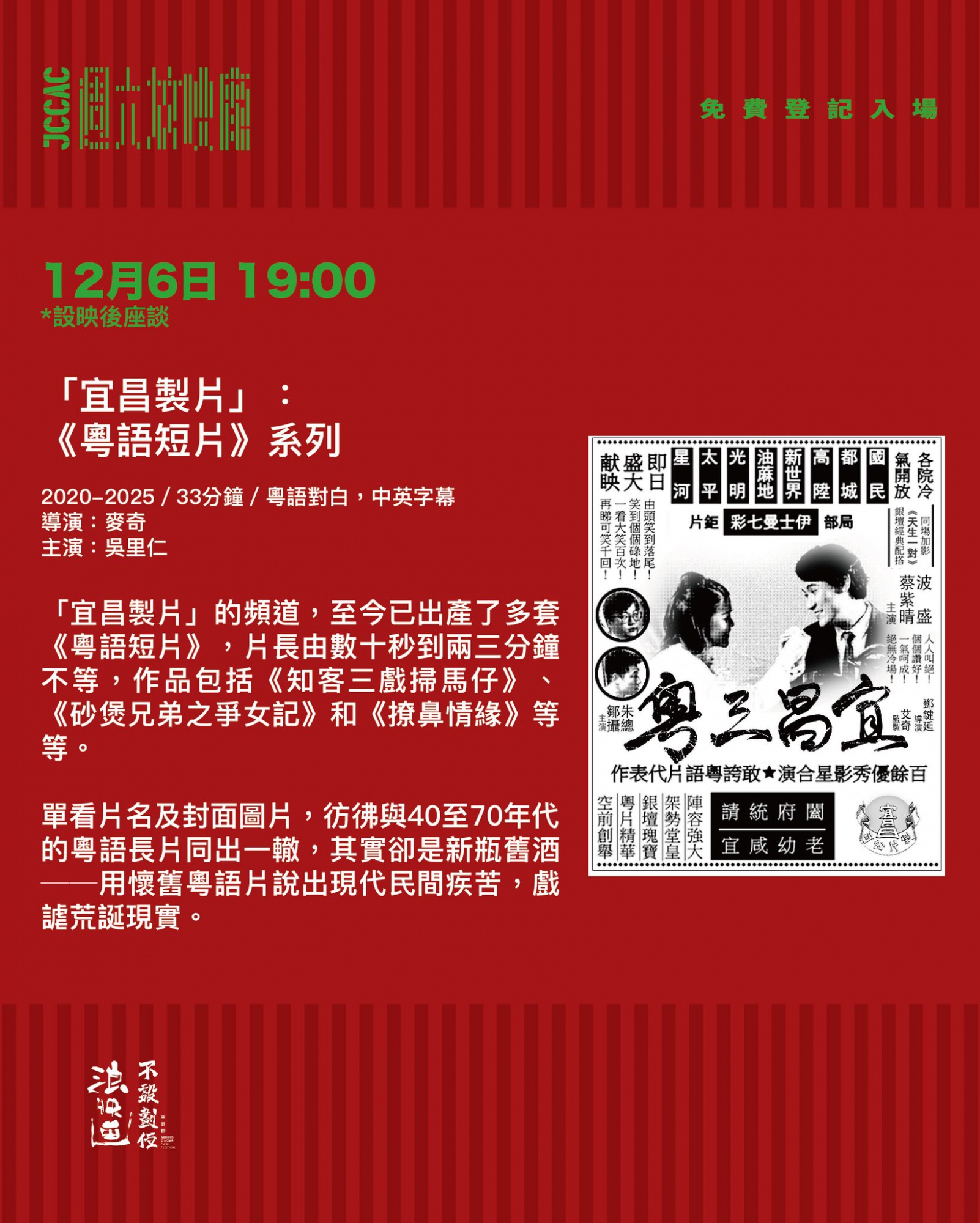好戲浪接浪!【JCCAC週六放映廠】自舉辦以來人氣持續攀升,掀起觀影熱潮,成為影迷心中不可錯過的每月電影之約。每月一期週六傍晚,我們在JCCAC中庭搭起銀幕,精心挑選電影佳片,為您帶來獨特的半開放式免費露天電影體驗。在微風輕拂的夜色中,邀請大家沉浸於光影世界,細味映畫中的歡笑與沉思。映後意猶未盡?座談會為影迷提供豐富的交流機會,讓電影的力量超越銀幕,觸動心靈。
