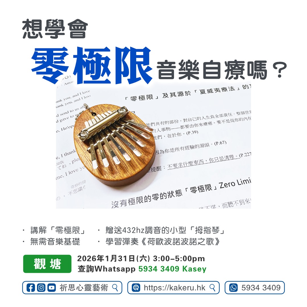 • 講解「零極限」的功效及應用 • 分享導師治愈20年嚴重偏頭痛的親身經驗• 贈送432hz調音的小型「拇指琴」• 學習彈奏《荷歐波諾波諾之歌》 • 可持續在家練習,有助清理淨化,自我療癒• 無需音樂基礎「零極限」清理自己,讓阻塞的能量重新流動,與神聖重新連結,轉化為愛。「拇指琴」婉如音樂盒般優美動聽,簡單易學,有助都市人放鬆靜心。2人即可成班!如時間不合適,歡迎組隊另約時間﹗快啲約埋朋友一齊~