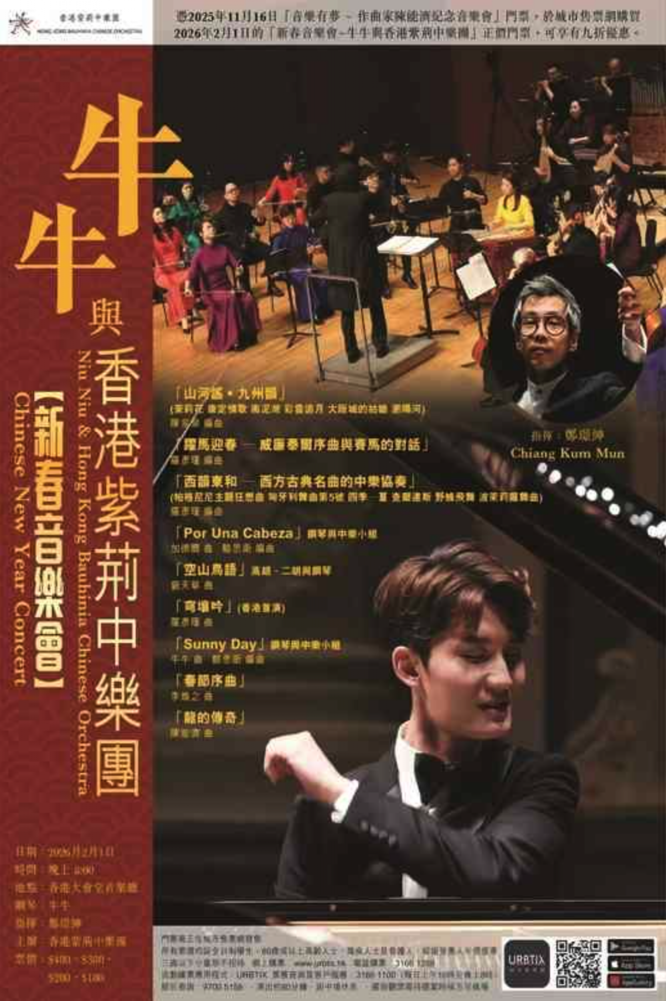 由香港紫荊中樂團主辦的新春音樂會,特邀知名鋼琴家牛牛和新加坡著名青年指揮家鄭璟紳攜手,以「中西樂韻賀新春」為主題,為觀眾帶來一場傳統與現代交融的新春音樂盛宴。