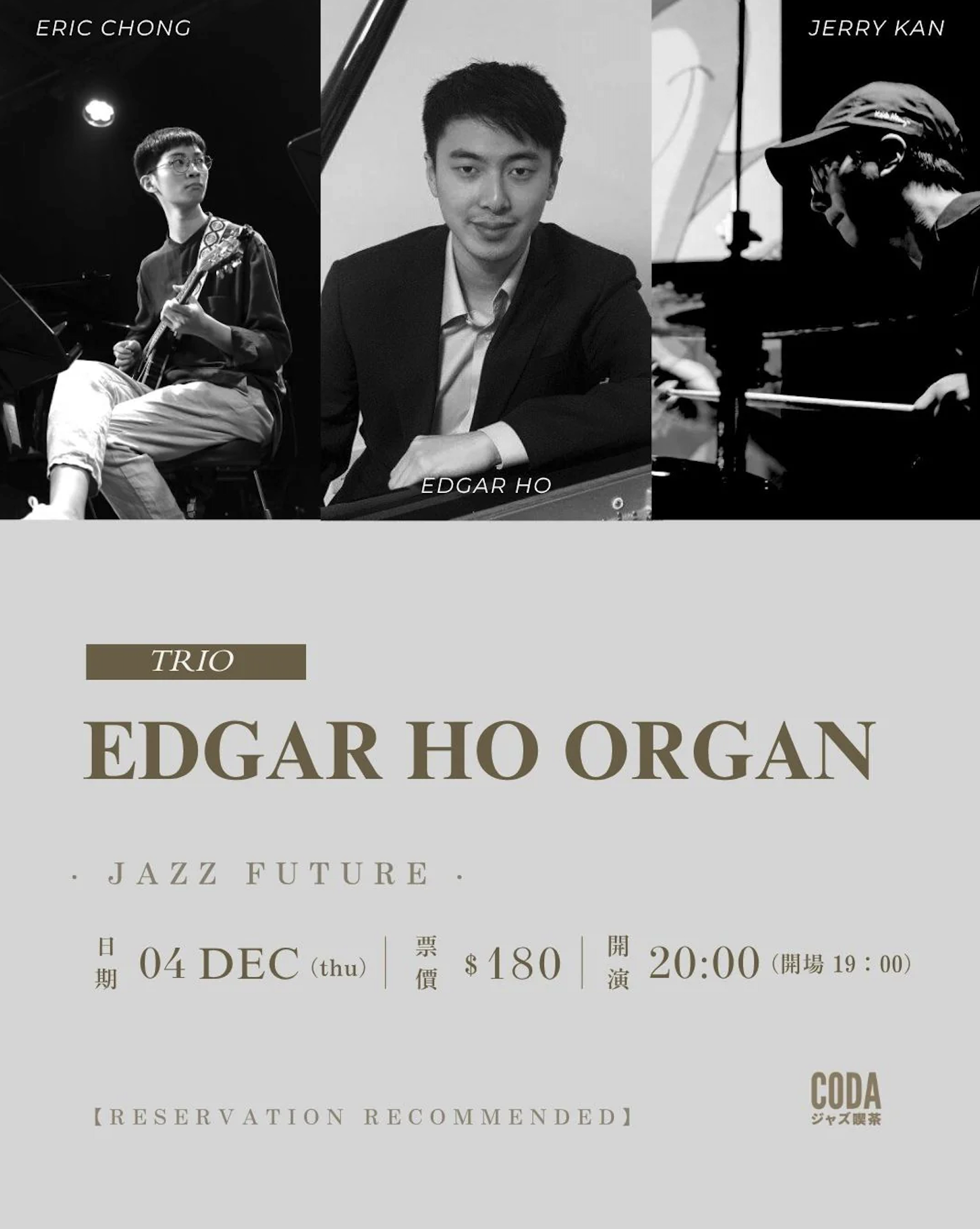 來自倫敦的鋼琴手 Edgar Ho 將為 CODA帶來首個Jazz Organ Trio演出,以 Hammond SK1 電風琴為主軸,聯手結他手 Eric Chong 和鼓手 Jerry Kan,演繹經典爵士曲目。