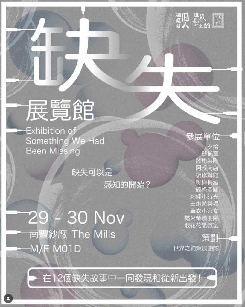 或許「缺失」可以是感知覺悟的開始,成為重新出發的動力。展覽由世界之約策展團隊策劃,展覽以透明氣球為媒介,新穎的表達手法展示過去一年12位合作夥伴「約好村莊村民」,他們缺失的故事。 從他們的物件和作品中認識他們如何在遭遇「缺失」下將「缺失」成為推動自己的動力。