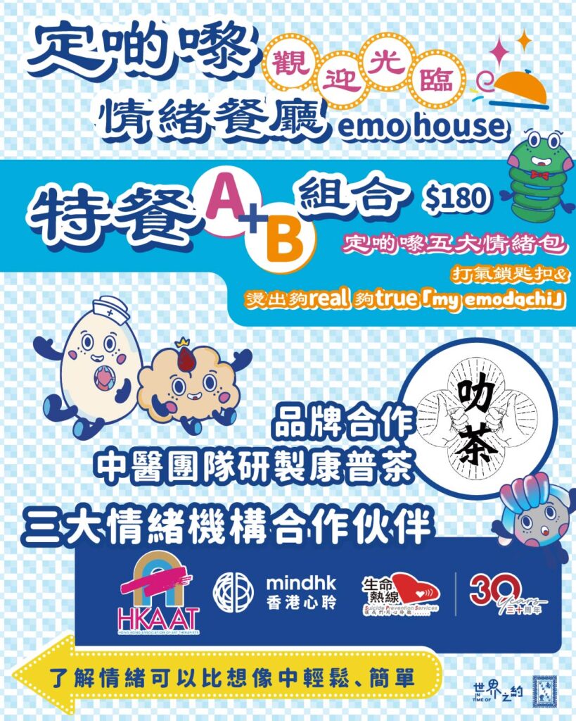 快閃出現的情緒餐廳會提供獨特的「自我情感認識」進餐體驗,參加者可以$180享用3道菜式:1.頭盤,是由3間情緒健康支援機構(Mind HK,生命熱線,香港藝術治療師協會)合作的小遊戲,可探索情緒,從心理測驗發掘自己內心的小角色;2.主菜,有5款精緻設計的情緒包應對不同情感狀態,從遊戲中放鬆心情與自己情緒對話;3.甜品,有11款打氣字句鎖匙扣以及超過40款燙印圖案,可為自己的情緒小夥伴(Emodachi)客製化一個屬於自己內心的模樣,作為甜蜜的結尾。