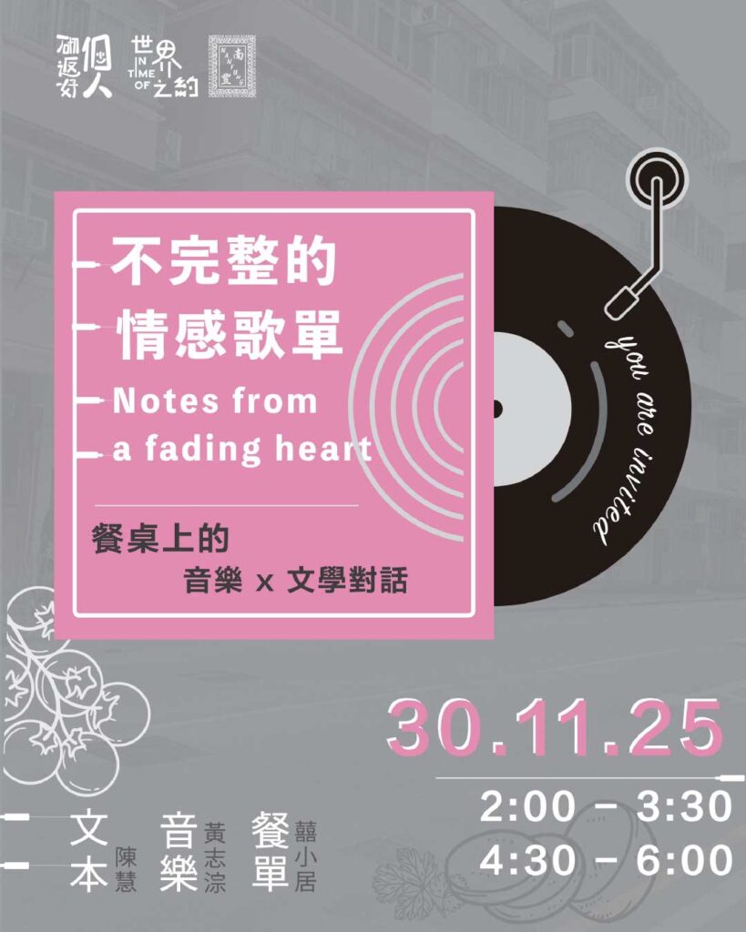 邀請到本地知名音樂騎師黃志淙博士(Chi Chung's Choice),以作家陳慧的作品《木棉情書》為靈感,精心編排歌單 ,用音樂傳遞都市人的心聲與情緒。故事中女主角穿梭城市各角落,每一幕都映照著我們或你、或他、或她熟悉的片段,希望觀眾在聆聽與品嚐的過程中,與自身的城市記憶產生連結,並在女主角的故事中找到屬於自己的情感共鳴。