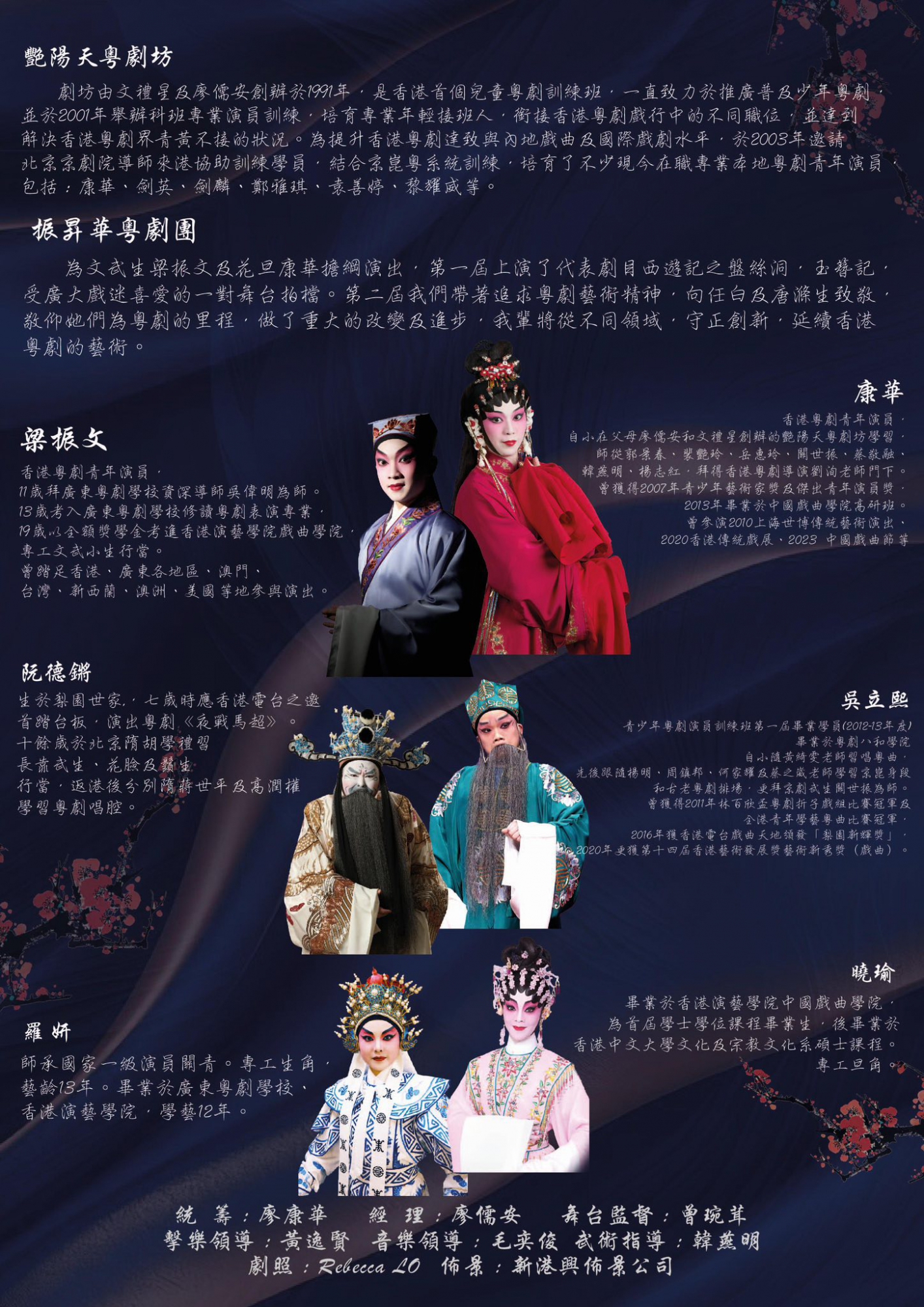 第一屆上演了代表劇目西游記之盤絲洞,玉簪記,受廣大戲迷喜愛。第二屆我們帶著追求粵劇藝術精神,向《任白》致敬,敬仰她們為粵劇的里程,做了重大的改變及進步,我輩將從不同領域,守正創新,延續香港粵劇的藝術