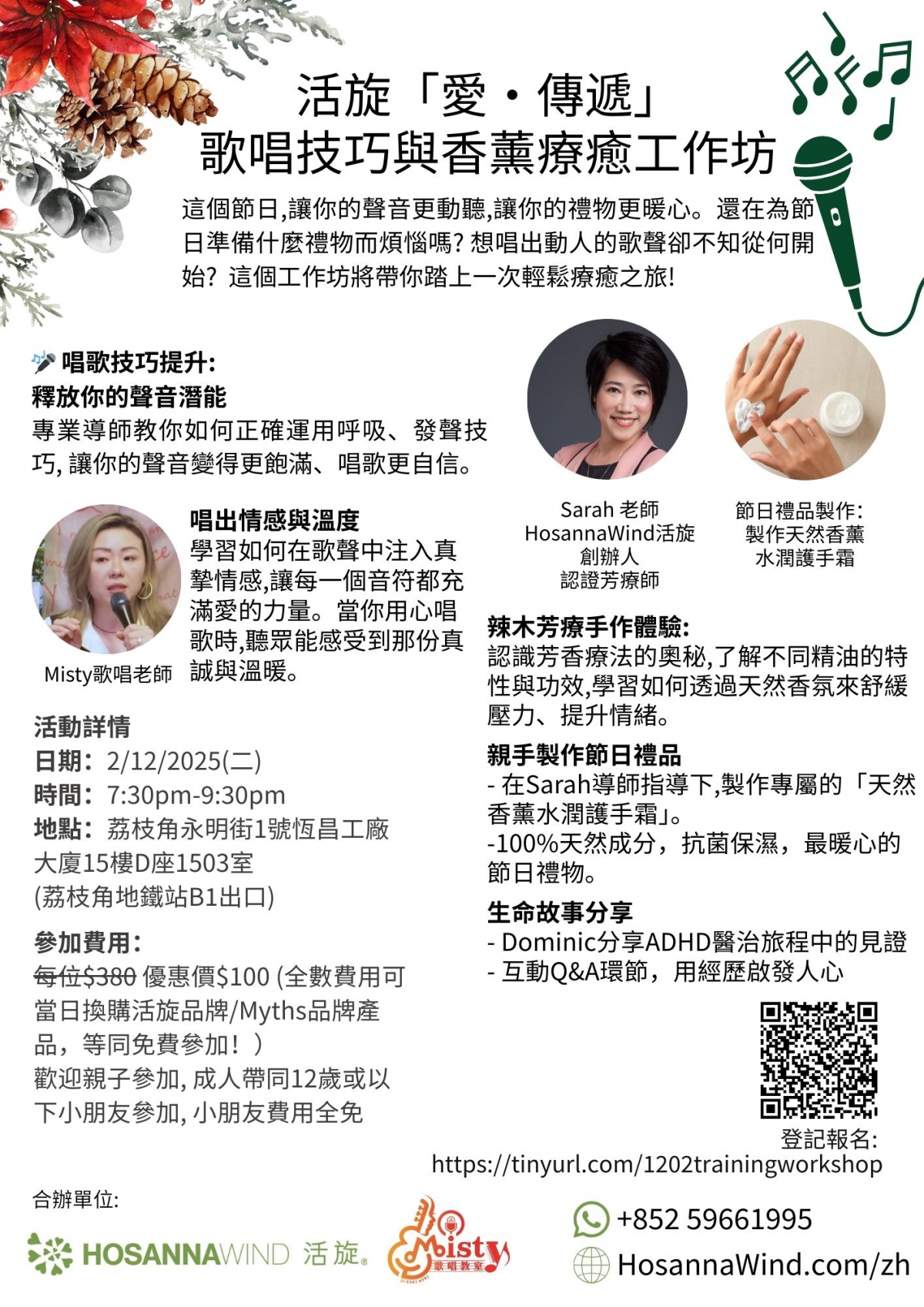 這個節日,讓你的聲音更動聽,讓你的禮物更暖心。 想唱出動人的歌聲卻不知從何開始?這個工作坊將帶你踏上一次輕鬆療癒之旅。