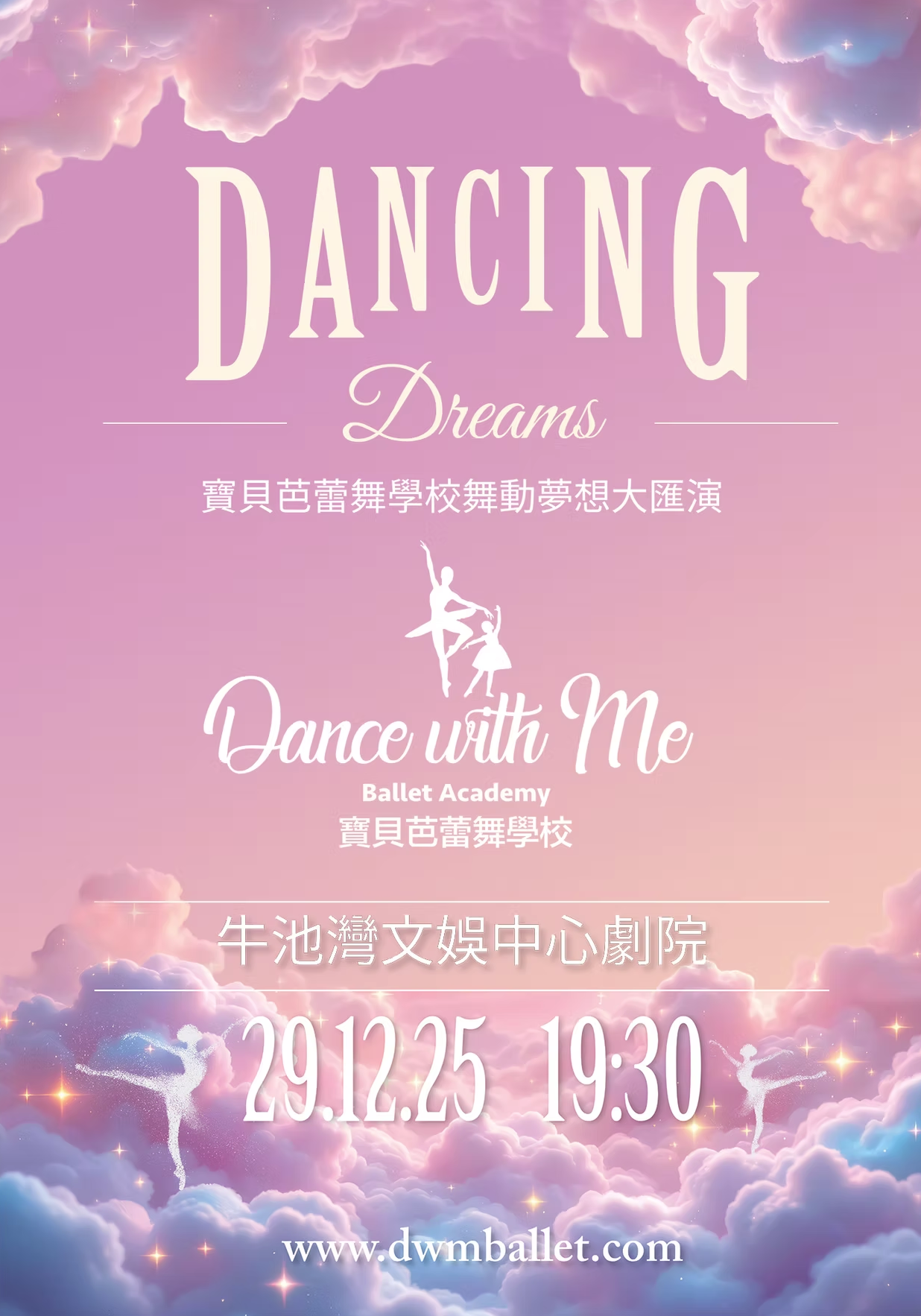 《寶貝芭蕾舞學校舞動夢想大匯演》隆重登場!一眾可愛又充滿活力的小舞者,將以純真與熱誠,為觀眾呈獻一系列精心編排的舞蹈演出。節目內容豐富多彩,小舞者們將化身為花仙子、小紅帽、木偶及糖果仙子等精彩的角色。每一個舞步、每一個笑容,都是小朋友們努力練習的結晶,蘊含著他們對夢想的追求與付出。在燈光與音樂的襯托下,他們將自信地綻放光芒,為觀眾帶來一場溫馨而夢幻的視覺盛宴。誠邀您一同見證這份成長與喜悅,與我們一同感受舞蹈的美好力量。與我共舞! 一切由心!