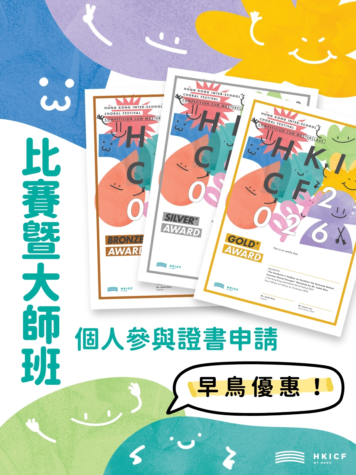 HKICF2026 為參加比賽暨大師班的合唱團團員提供個人參與證書。證書將印有參加者姓名、所屬合唱團及比賽成績,讓參加者能夠紀錄這次比賽的經歷。