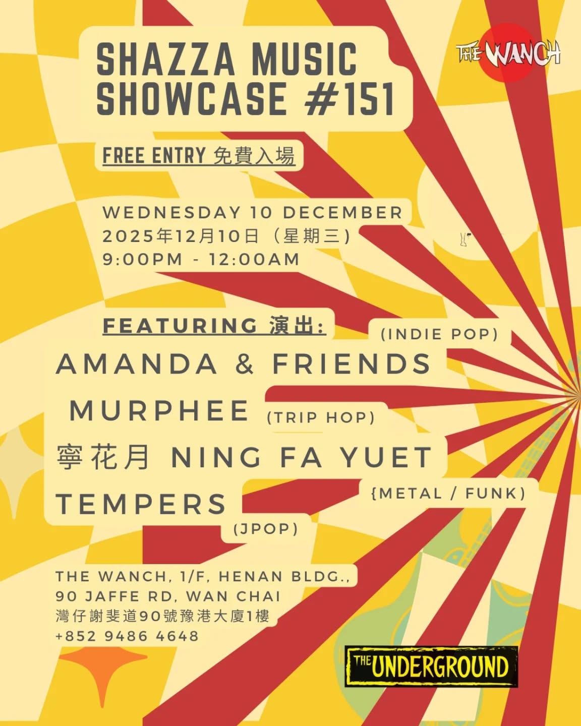 The Underground HK 又嚟啦!今次喺 2025 年 12 月 10 號(星期三)於 The Wanch 舉行 Shazza Music Showcase #151。由晚上 9 點開始,四隊香港有潛質嘅本地樂隊會用現場音樂同熱情為大家送上一個難忘嘅夜晚。免費入場,約埋班朋友嚟睇 show,感受下香港 indie 音樂場景嘅活力,一齊支持下本地原創力量!