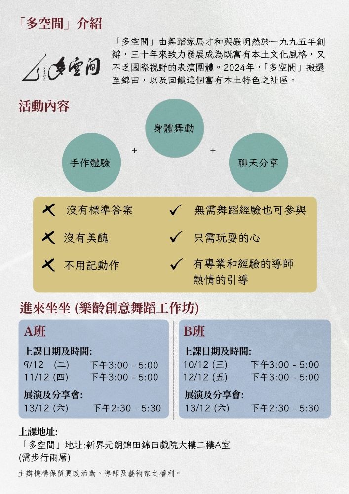 我們邀請大家將那個「悠閒時光」變成生活中的正經事,一起共度每日所需的身體運動、手作體驗和聊天分享。過程中會有熱情的引導,整場絕對沒有標準答案、沒有美醜、不用記動作。只要帶著一點點自由的玩心,讓我們陪伴你享受聚會帶來的美好能量!進來坐坐吧,一起走走晃晃搖搖擺擺一起跳舞真的會快樂。