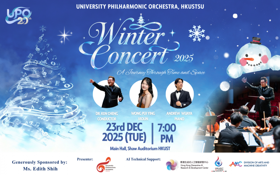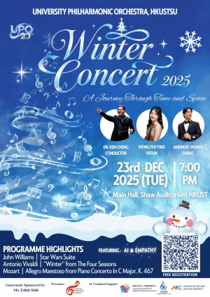 This Winter Concert is more than just a celebration of Christmas; it takes audiences on a musical voyage across galaxies and time, with pieces ranging from Star Wars to Mozart. Through a carefully curated selection of orchestral works, we will guide listeners from the mysterious vastness of outer space to the grandeur of bygone eras. This time, we feature a collaboration with the Hong Kong Generative AI Research and Development Center, uniting live orchestral performance with real-time EEG and AI to transform emotion into a shared, visual landscape.