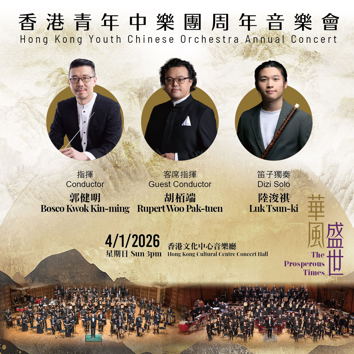 香港青年中樂團將於2026年1月4日下午3時,在香港文化中心音樂廳呈獻周年音樂會「華風盛世」,並特邀香港青少年中樂團作客席演出。