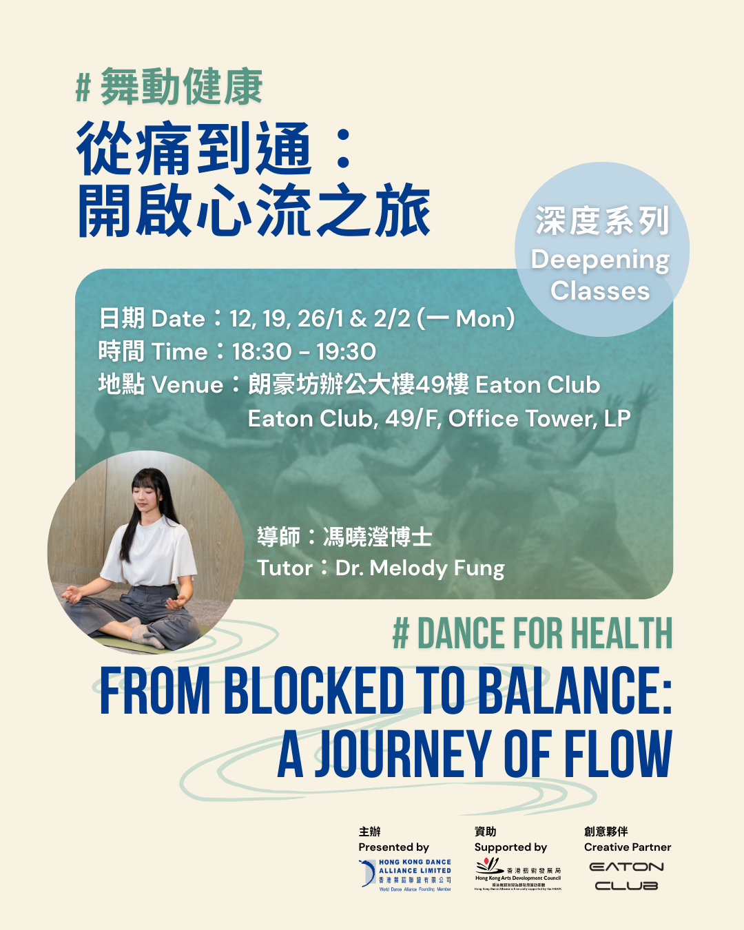 Dr. Melody 將繼續結合當代科學,配合身體律動,帶你由淺入深,用最溫和、有意識的身體流動,一步一步助您打通阻塞,重拾身心平衡與暢通。