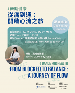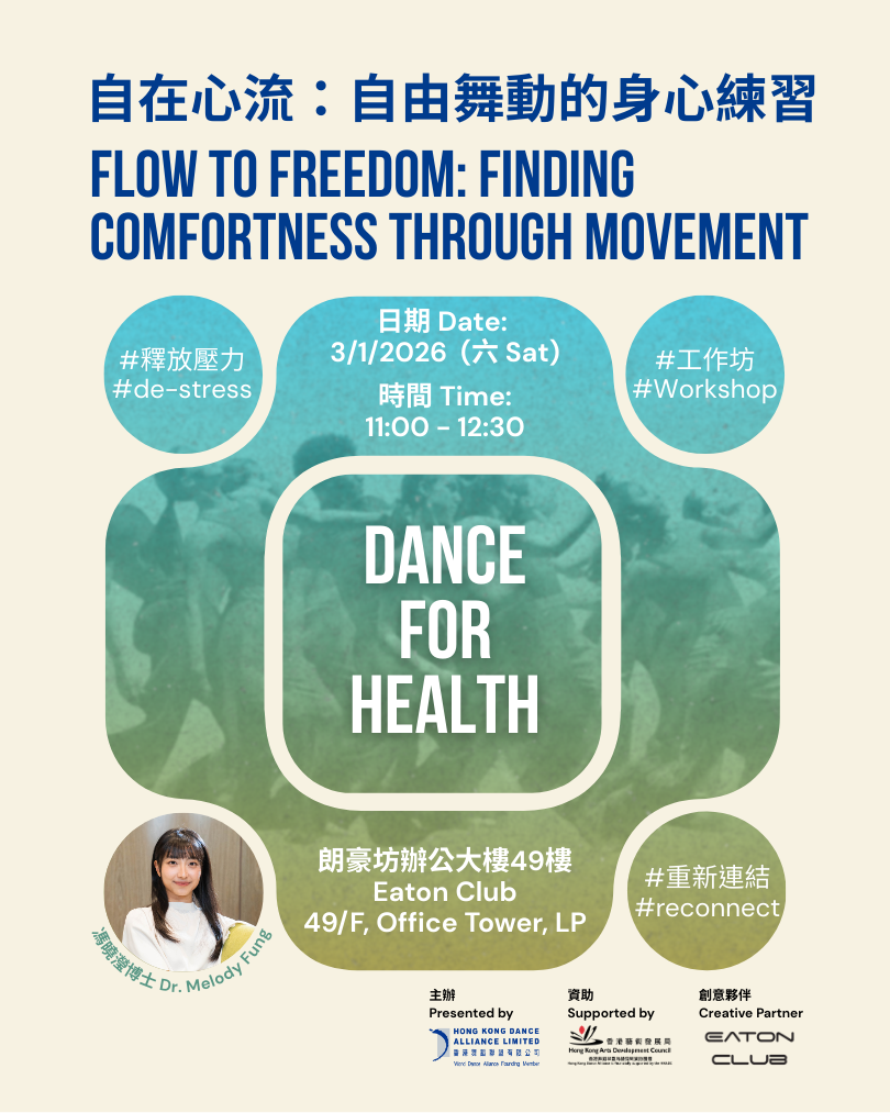 香港舞蹈聯盟致力於推動舞蹈界發展,並探索舞蹈對社會不同群體的幫助。我們與創意夥伴 Eaton Club 合作推出六期《舞動健康》系列,展示舞蹈在維繫身心健康的功用。這個系列將結合科學、運動和舞蹈實踐,促進跨學科對話。
