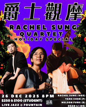 Rachel 將耳熟能詳嘅聖誕歌,重新編成輕快又舒服嘅爵士版本。由喺紐約趕嚟嘅 Yang 負責鋼琴,加上 Nelson 嘅低音大提琴同 Dean 嘅鼓,為你送上一个暖笠笠嘅音樂晚上。