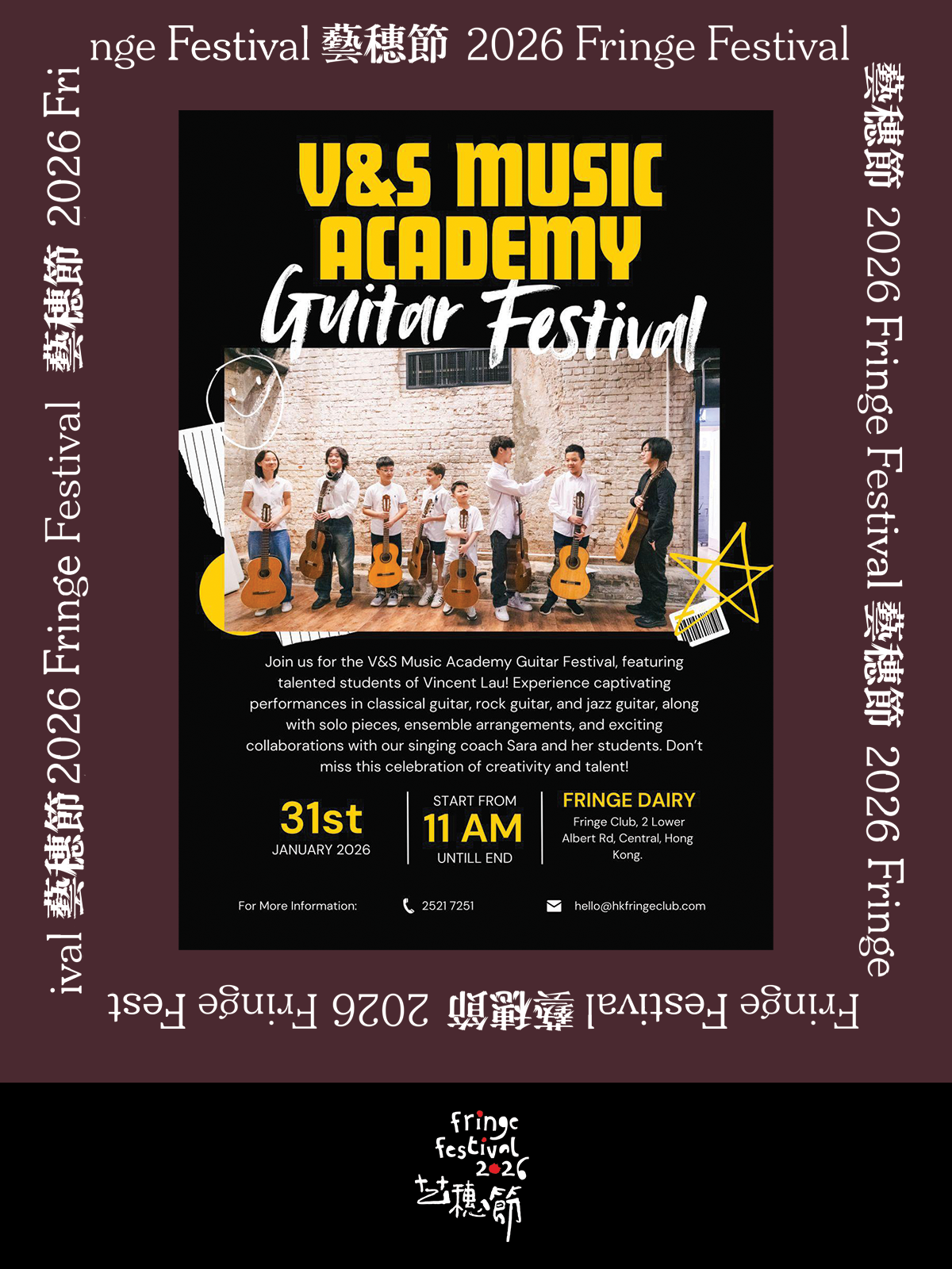 Join us for the V&S Music Academy Guitar Festival, featuring talented students of Vincent Lau! Experience captivating performances in classical guitar, rock guitar, and jazz guitar, along with solo pieces, ensemble arrangements, and exciting collaborations with our singing coach Sara and her students. Don't miss this celebration of creativity and talent!