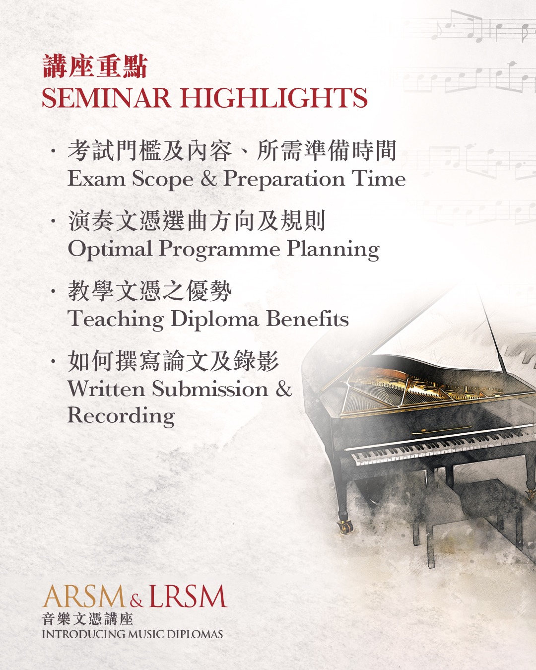 在此次講座中,除了講解 ARSM 及 LRSM 演奏文憑的選曲方向與準備要求外,Camelia還會分享導師考取教學文憑的價值及論文撰寫技巧,幫助每位導師輕鬆提升自己,增加學生人數。