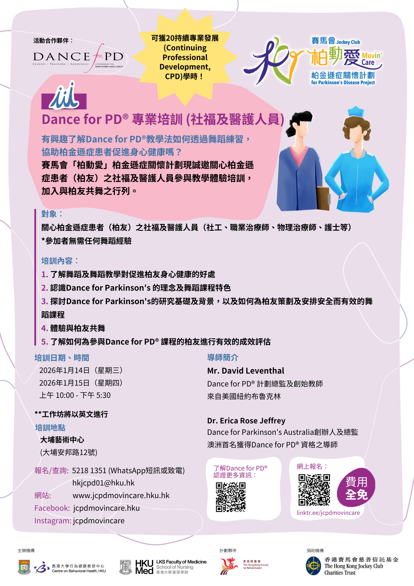 賽馬會「柏動愛」柏金遜症關懷計劃現誠邀關心柏金遜症患者(柏友)之社福及醫護人員參與教學體驗培訓,加入與柏友共舞之行列。