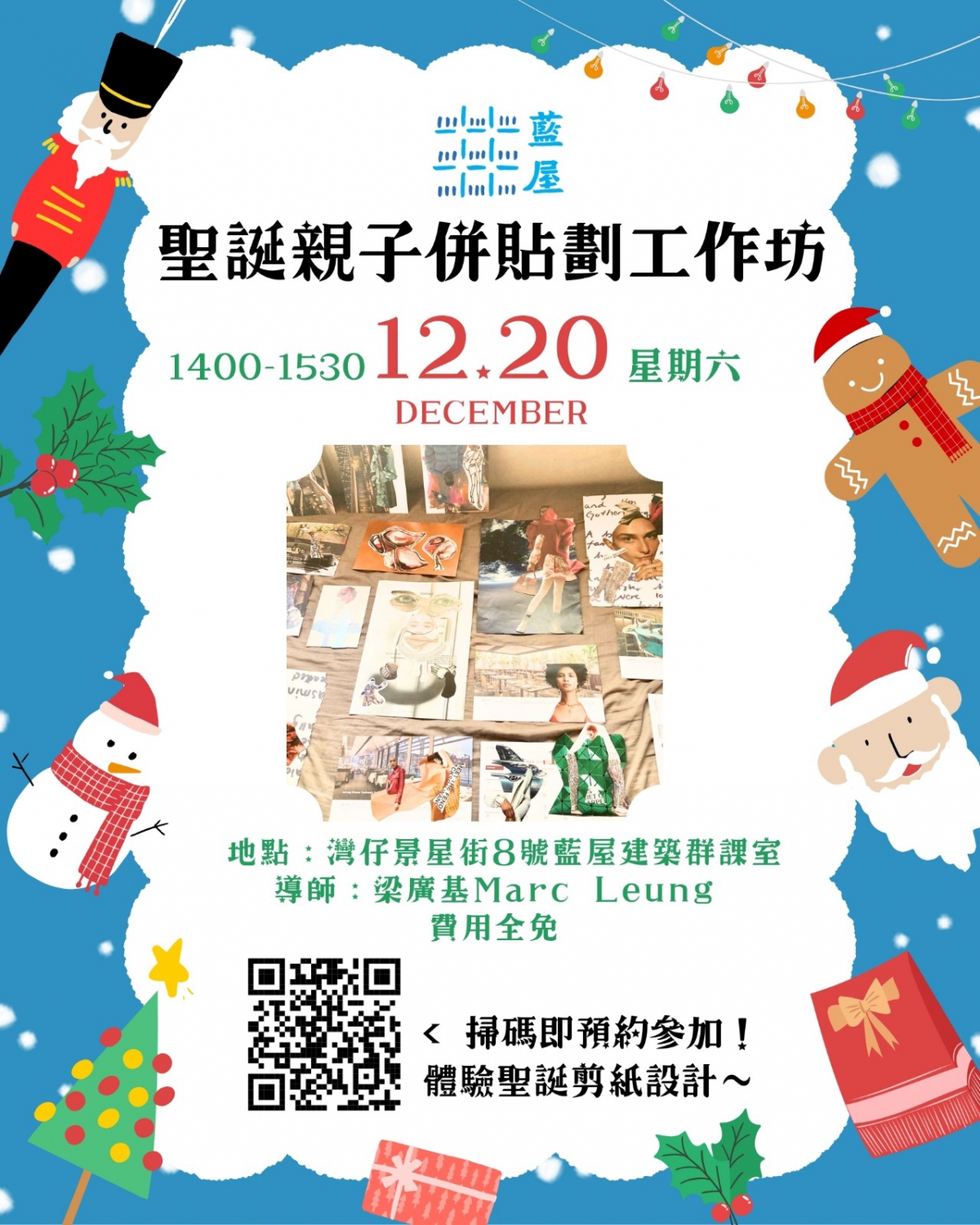 用雜誌、貼紙、彩紙等豐富材料,一起創作獨一無二的聖誕拼貼小作品!在輕鬆的手作過程中,小朋友可以學習配色、形狀組合,同時培養觀察力與專注力,爸媽也可以享受難得的親子創作時光。日期:2025年12月20日 (六)時間:下午2:00-3:30地點:灣仔景星街藍屋建築群空地名額:每節10對親子組合 (全免)