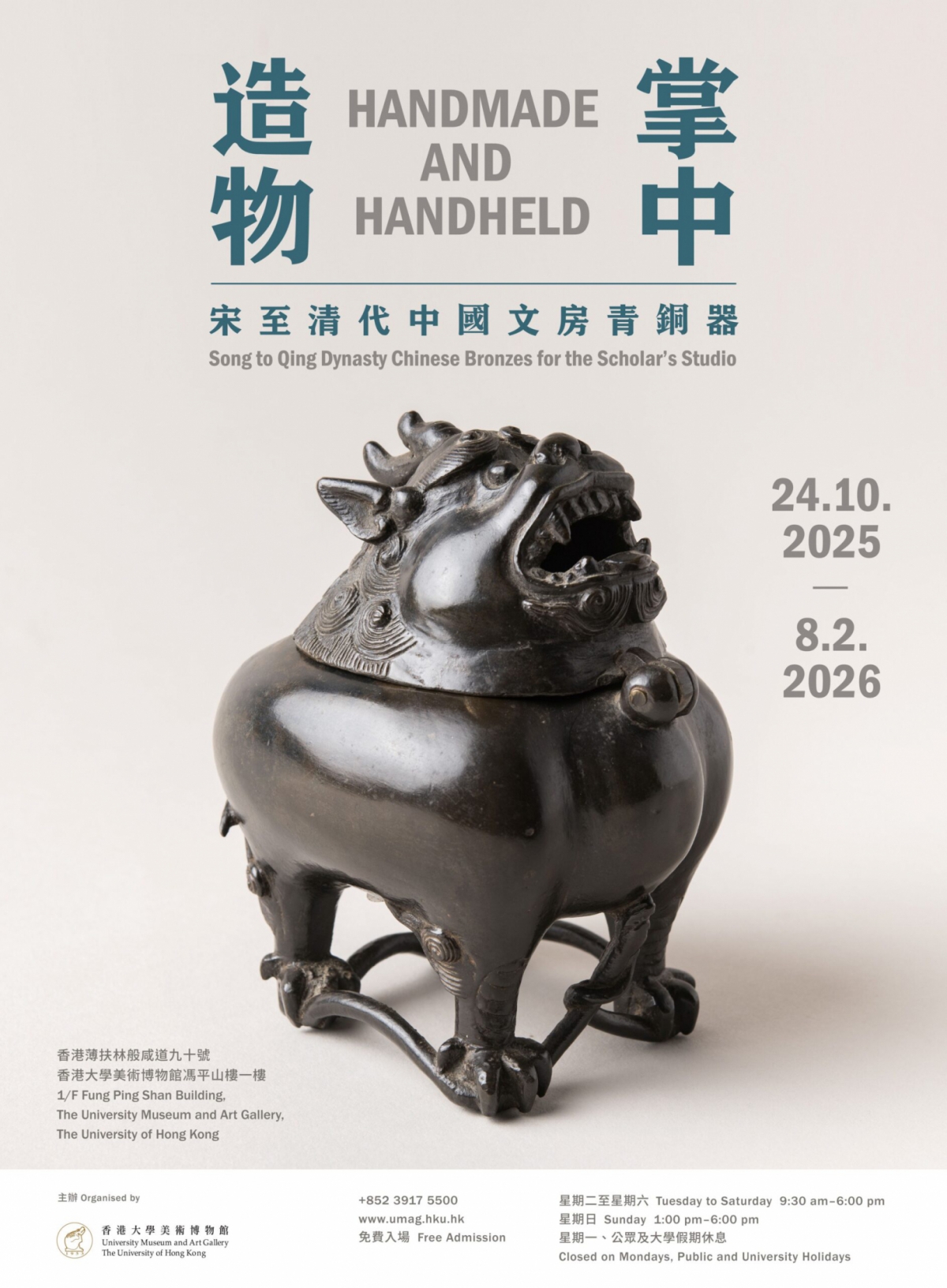 香港大學美術博物館欣然呈獻「掌中造物——宋至清代中國文房青銅器」展覽,精選八十七件青銅器物,勾勒出由古代禮儀傳統至文人美學思想延展的文化脈絡。這些青銅器超越了原本的禮制功能,而是被視為藝術珍品、文人探究的對象,以及承載着道德與政治的理念。它們的形態多樣,從莊重的禮器到精緻的香爐與書齋文房,反映青銅工藝如何融入帝王與文人文化之中。 因此,器物上的植物和動物形象—無論源自神話或現實—大多承載重要的吉祥寓意,豐富了它們所源出的文化傳統。