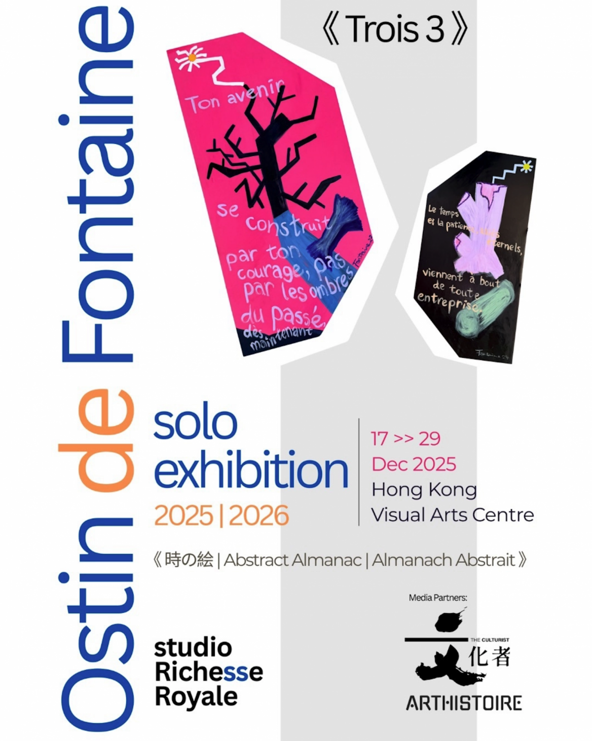 國際新星藝術家 Ostin de Fontaine 將於 2025 年 12 月推出重要個展《時の絵 | Abstract Almanac | Almanach Abstrait》,展出共 24 件作品,其中包括精選自其《Trois 3》系列中的 12 件畫作。展覽將在香港、東京與巴黎三地相繼舉行,呈現藝術家對時間、自然與文化記憶的深刻思考。