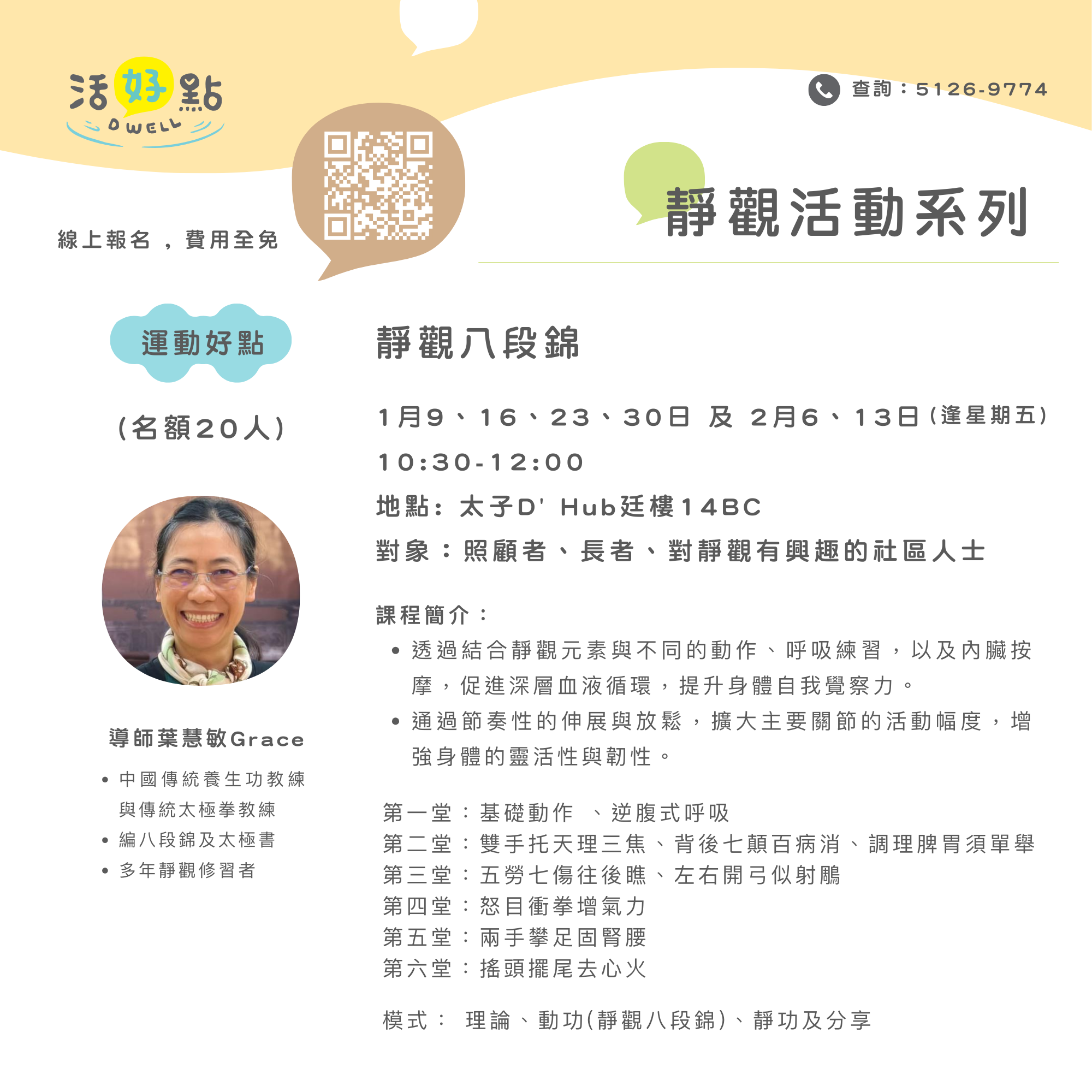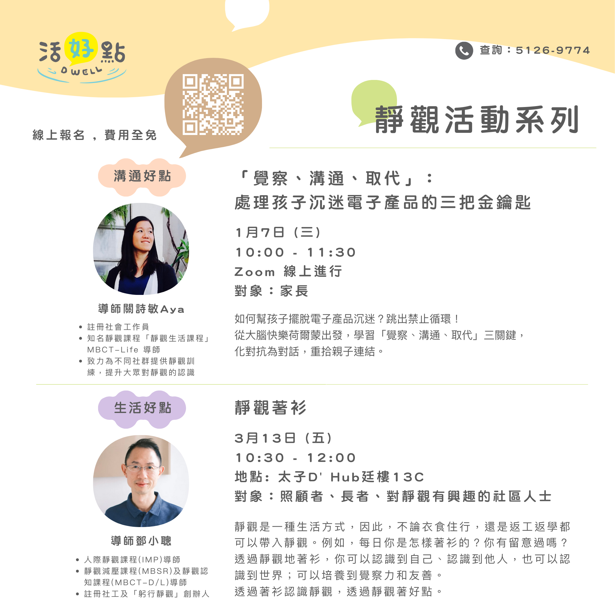 不論你是長者、家長、照顧者、助人者,還是對靜觀有興趣的社區朋友,都很歡迎來到活好點,為自己預留一點時間,讓身心慢慢安頓下來。一起在不容易的日子裡,學習溫柔地照顧自己。