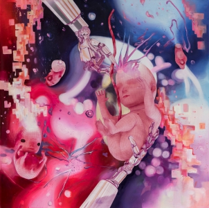 在繪畫作品裡的各類動物和日常符號則有著不同象征:蛇、鶴與老虎分別象徵慾望、忠誠與背叛;吸煙、飲酒、約會與養寵物則凸顯著人類慾望的商品化。王韞琛透過哺乳、分娩與生殖器官等意象的交織,構建出一個融合有機與人造物的敘事,模糊了幻想與夢魘之間的界線。