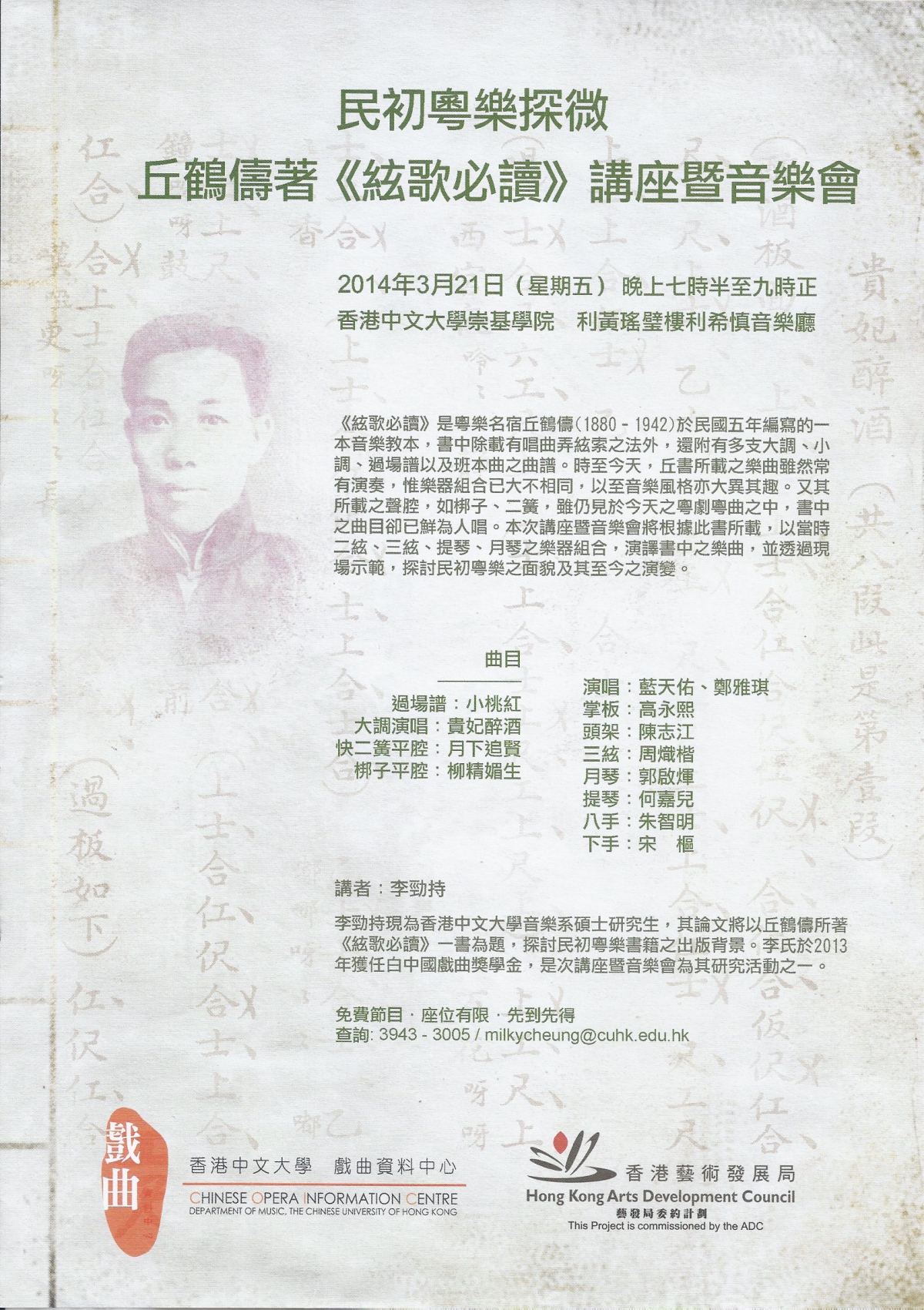 《絃歌必讀》是粵樂名宿丘鶴儔 (1880-1942) 於民國五年編寫的一本音樂教本,書中除載有唱曲弄絃索之法外,還附有多支大調、小調、過場譜以及班本曲之曲譜。時至今天,丘書所載之樂曲雖然常有演奏,惟樂器組合已大不同,以至音樂風格亦大異其趣。又其所載之聲腔,如梆子、二簧,雖仍見於今天之粵劇粵曲之中,書中之曲目卻已鮮為人唱。本次講座暨音樂會將根據此書所載,以當時二絃、三絃、提琴、月琴之樂器組合,演譯書之樂曲,並透過現場示範,探討民初粵樂之面貌及其至今之演變。