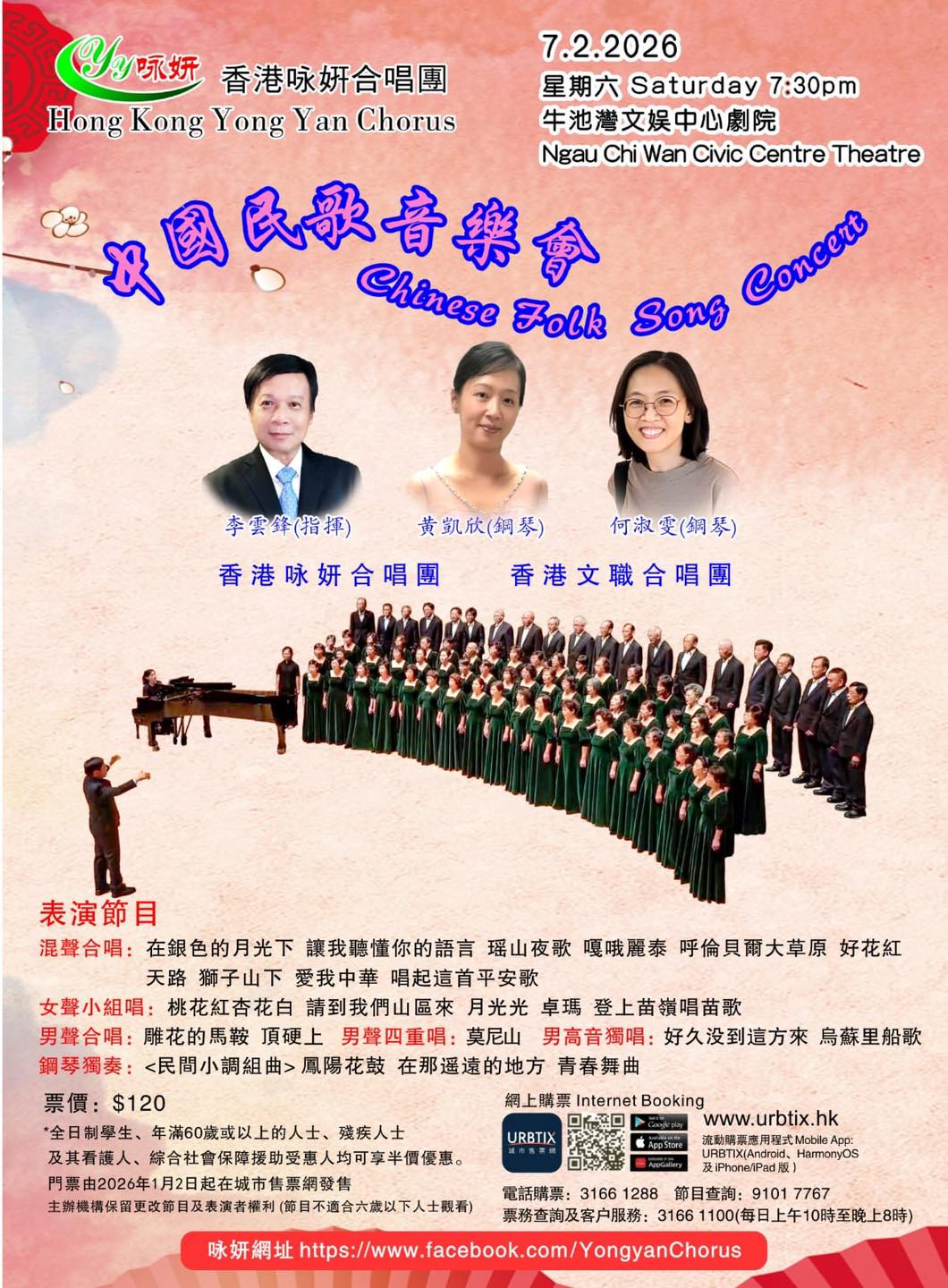 香港咏妍合唱團2026年港九新界巡迴音樂會的第一場「春之聲音樂會」在新界北區大會堂演出。而第二場 - 「中國民歌音樂會」,將移師九龍牛池灣文娛中心劇院,並訂於2026年2月7日晚舉行。門票於明日(1月2日)開始在城市售票網發售。當晚演出的歌曲非常豐富精彩。期待大家蒞臨欣賞,與我們共渡一個愉快的晚上。