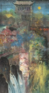 司徒老師聽過故事,對歷史的情懷抒發。他以為是寫畫古琴,必須要有音樂韻律在其中,特意買來古琴的CD,作畫時候都要聽著,同時畫出曾經到遊邀山閣的記憶,邀山閣是廣州四大名園之一,建於清道光三十年(1850年),已有逾170年歷史。一系到畫作設色深厚沉鬰,氣氛幽玄,將歷史故實融合庭園景緻,彷彿引領觀者超越古今時空之限,呼息文人氣節操守,亦對先烈表示恭謹致意,極具創意。這個系列共有八張,以顏色作音符,畫出高山流水和瀑布,邀得自然山水共鳴的詩意。為了這個系列,買了古琴,特意在畫中寫有古琴,貫穿整個系列。