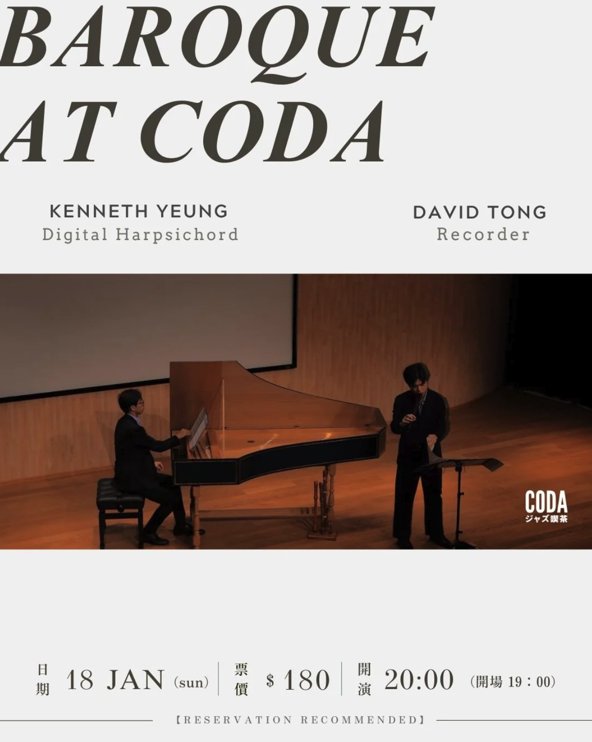 長笛與羽管鍵琴的60分鐘二重奏。韓德爾、泰勒曼與霍特泰爾的古典作品,與巴洛克核心即興形式並置:無拍號前奏曲、悼念大埔火災遇難者的紀念組曲,以及以《普世歡騰》為主題的隨想曲。古雅音色與現代酒吧空間交融——以巴洛克技藝回應當代瞬間,以溫暖沉思與一抹即興,引領聽眾沉入夜色。