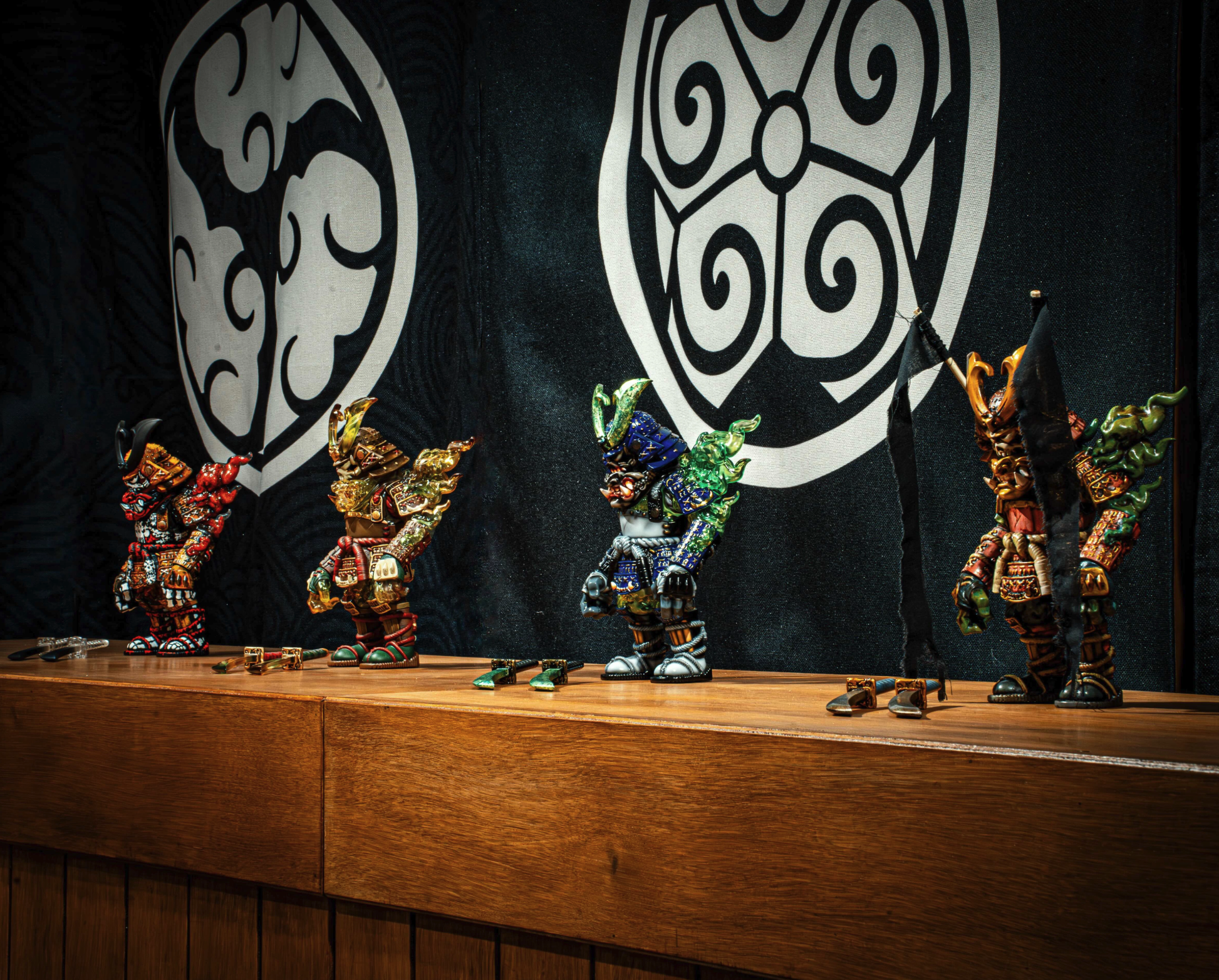 展覽《五輪》之名是指地、水、火、風、空五大要素,源自日本佛教哲學與武士道精神,亦是日本武士修煉身心的五個階段。設計師GINO LAI藉此探索生死、意志與靈魂,並創立其玩具雕塑系列。是次展覽以三位戰士的意志 -「執念・燃燒・輪迴」作為命題:平安末期的源義經,被兄長背棄後內心的不平與忠誠代表「執念」;安土桃山的真田幸村,明知勝利渺茫仍然不屈的精神代表「燃燒」;鎌倉末期的楠木正成,其七生報國的誓言讓信念穿越生死時間代表「輪迴」。這三種形態意志,在展覽中串連靈魂生生不息的軌跡,並以此設計出三款極具壓場感的 60CM 大雕像,細膩刻畫武士鎧甲的厚重與靈魂的張力,映出武士貫徹信義的俠道與極致執念,三款雕像同樣開放預訂。